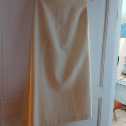 Glatt fint stoff. Liten usprettet lomme venstre side foran. Knapp og skjult glidelås 19 cm, midt bak. 67 % Polynosic, 33 % Polyester. Helfôret. Ikke stretch.