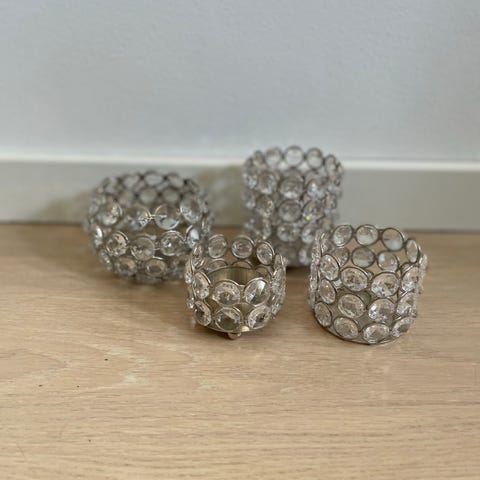 Telysestake. Sølvfarget med klare stener. Veldig pen og dekorativ. Passer til små telys. Lite brukt. Høyde: 6 cm. Diameter: 5,5 cm.