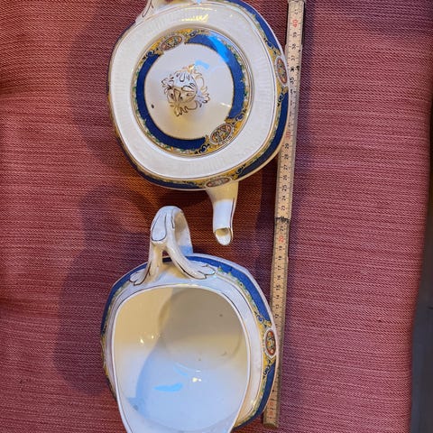 Meget elegant og stilig service sett med vakre detaljer i blått og gull farge. Denne er unik i sin stil da formen på service sett er formet kvadratisk.
