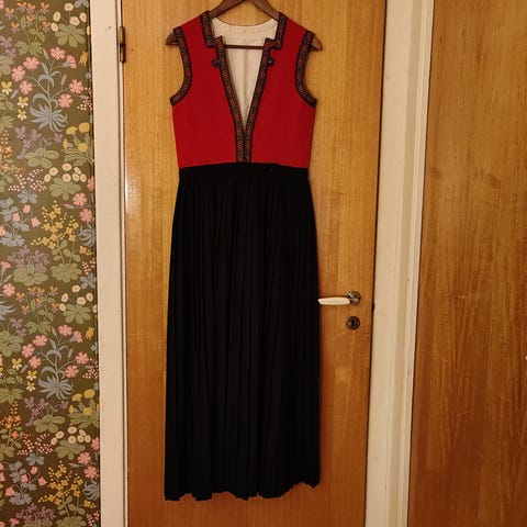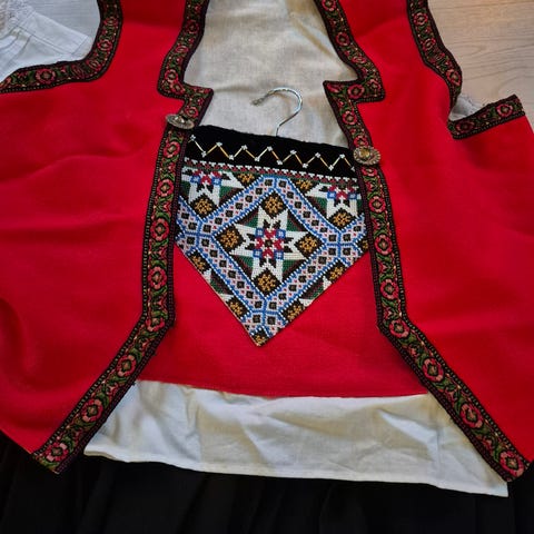 Nydelig bunad vurderes solgt , følg ikke med konebelte . Selges med perlebelte som vist på bilde , Pris er og uten sølv , er str S men passer og liten M ,