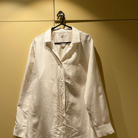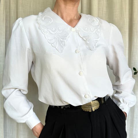 Vintage bluse med gullknapper selges rimelig. Str. 40. Vanlige knapper som ikke er synlige nedenfor gullknappene, så blusen kan åpnes helt. Merkelappen er revet delvis bort, men jeg ser i alle fall at det står 65 % viscose.