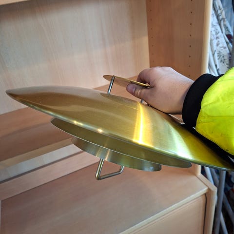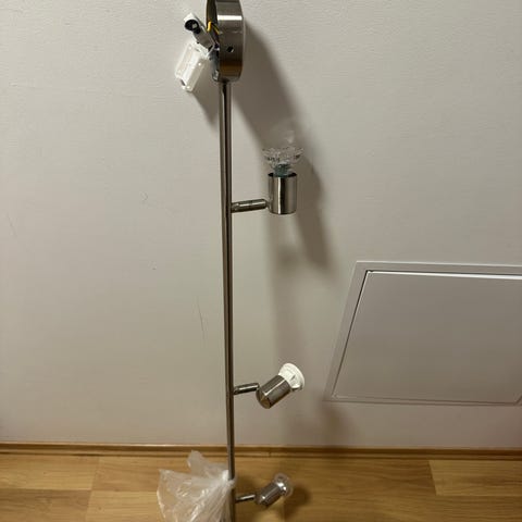 Smijernslampe. Keramikkskjerm i midten. Smijern i ytterkant, med plass til 6 telys og 6 talglys. Gir lun, god stemning på hytta! Medfølger smijernsledd for å justere høyden.