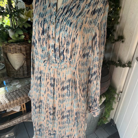 Lett og deilig sommerkjole i silkechiffon. 100% silke fra danske Custommade. Kan også bruke som storskjorte over hvite linbukser f.eks.