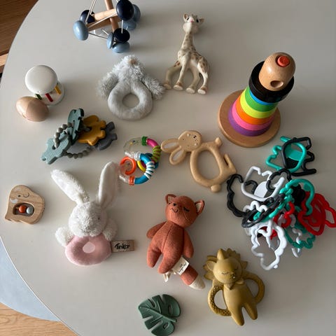 Noen bøker, biteleker, skrangle etc.