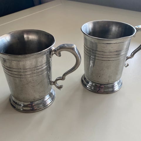 Små krus i glass og tinn, diameter 4,5 cm og høyde 6 cm
