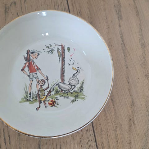 Et stort porselensfat fra Stavangerflint Porselen. Noen bruksspor, men fortsatt pent.