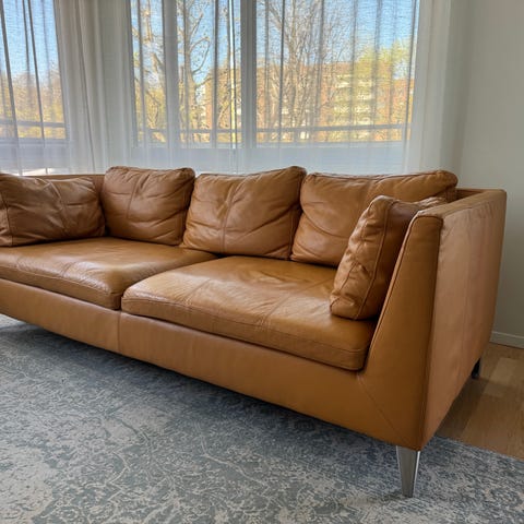 Har en flott 3 seters sofa av typen Stockholm i mørk brun skinn. Ny pris nesten 20000 kr.