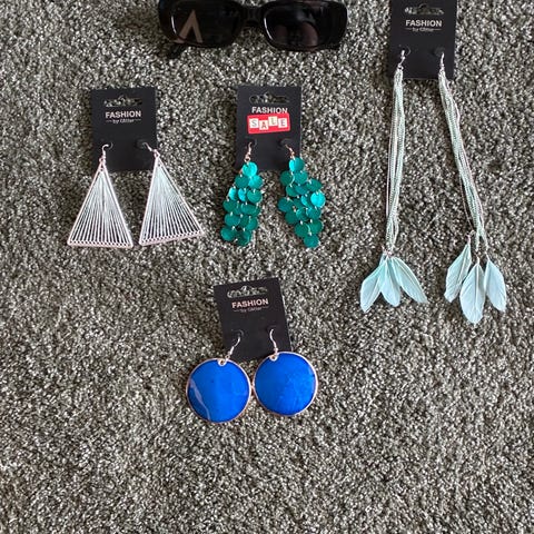 Her er 4 par øredobber med vakre detaljer, steiner og perler i fargene hvit, blå og sølv.