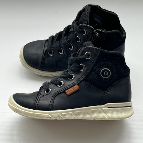 ECCO unisex barnesko i størrelse 22. Skoene er sorte med hvite lisser og har en praktisk glidelås på siden. De er laget for å gi komfort og støtte til små føtter.