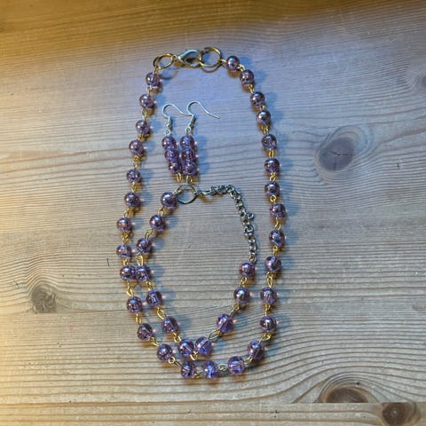 Et armbånd med strikk som passer alle, og et kjede som er 50 cm langt, fra SNÖ of Sweden. Lilla steiner og sølv farget. Ingen merker eller skader.