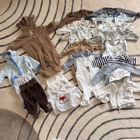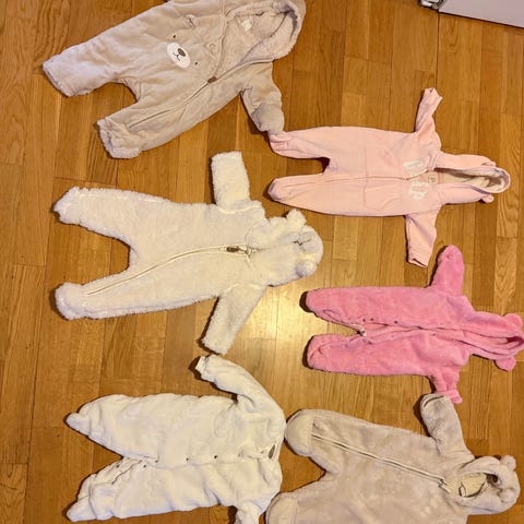 Består av 4 dresser, 1 sparkebukse, 4 bodyer, 2 bukser, 1 t-skjorte, 4 par sokker og 3 luer.
