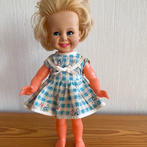 Sindy i flott stand. Særs bevegelige og myke armer og ben da hun kan danse ballett. Originale ballettsko. Merk at borrelås på overdel drakt sitter løst. Drakten og strømpebuksen er muligens kjøpt som et ekstra sett, og ikke originalt kjøpt sammen med denne dukken.