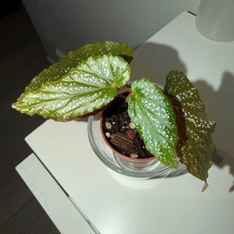 Har flere rotede stiklinger av denne nydelige begoniaen. Trives i sol med moderate mengder vann. Vokser fort