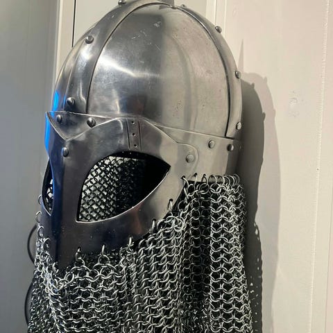 Blank metall og skinnreim inni hjelmen til å stramme og feste hjelm.