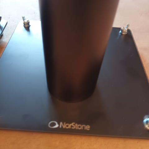 2 elegante stativer for høyttalere i blank svart stål og glass.