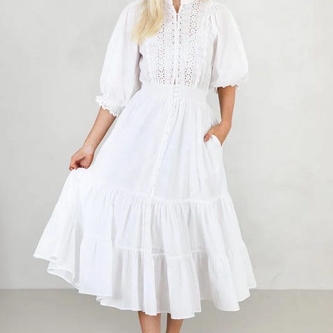 En drøm av en kjole med fine detaljer med snøring på begge sider, bølgesøm ved halsen, stor vidde i skjørtet og side lommer