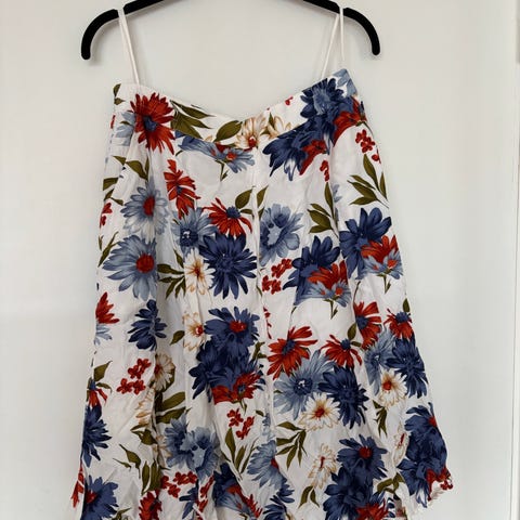 Sommerskjørt. Kjøpt brukt på marked i Finland, trolig hjemmesydd. Mørk bunn med blå, grønn og rosa. Blomster og blader.
