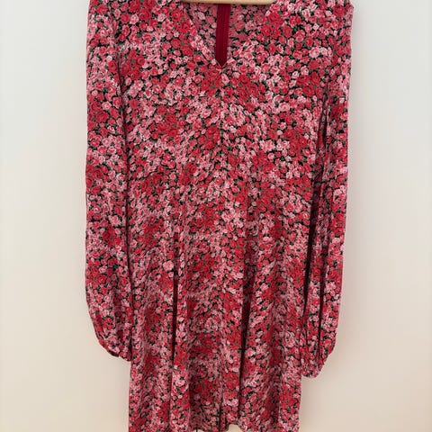 Str 36. Pen kjole med blomstermønster. Rysjer langs armene.