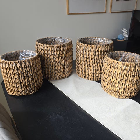 5 pyne kurvpotter , 3 er store H 25 cm, 2 er litt mindre H 20cm. Ordinær pris 1350kr. Det ble kjøpt i fjor, men var det feil størrelse. Det er nesten nye. Selges samlet for 500kr. Eller 125 kr.per