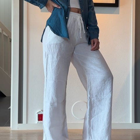 Lys bukse med høyt liv fra Tusnelda Bloch i størrelse 36-livvidde er 78 cm, skrittlengde 37 cm og indre benlengde 62 cm. Laget av 93% bomull og 7% spandex, god stretch i stoffet. Lommer både fremme og bak, lukkes med hempe og glidelås i front. Pent brukt uten flekker eller skader.