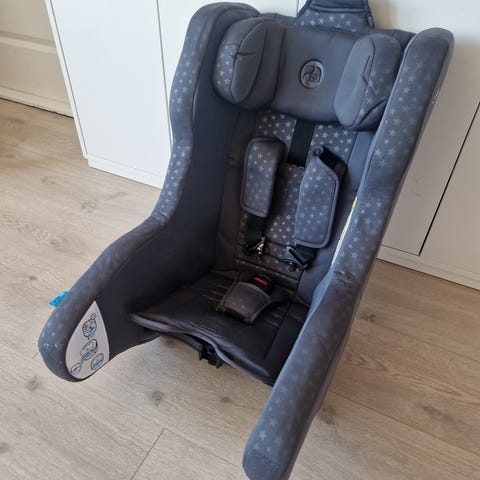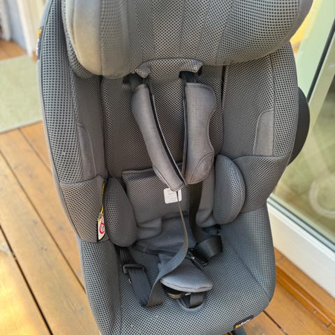 Det følger med bærbar elektronisk pumpe, ladekabel og transportbag som fungerer som nettbrettholder i setet. Bilsetet er godkjent for barn opptil 5 år, maks 18 kg.