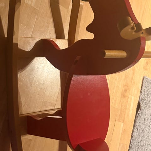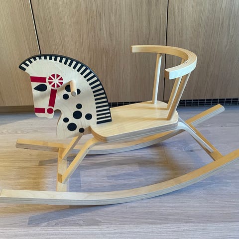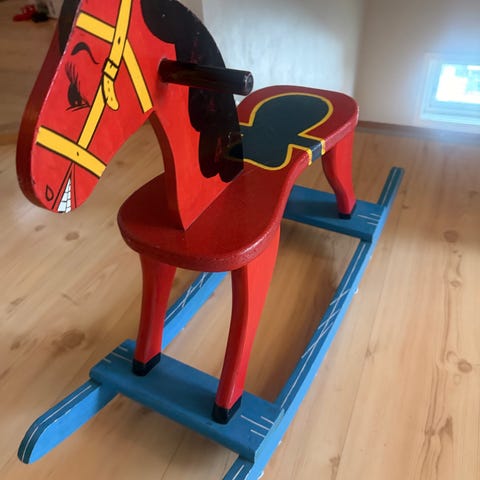 En gyngehest som føles trygg for de minste ved at man sitter som i en stol.