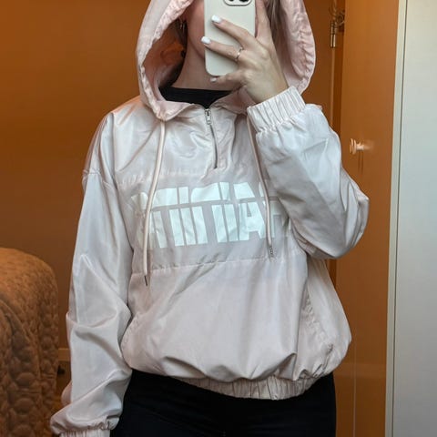 Spesialdesignet adidas lett anorakk med snøring i liv og armer. Printet tekst på rygg Str. L eller amerikansk 18 Parley kun brukt 3 ganger. Selges grunnet litt for liten for min smak.som ny hentes i Motzfeldts gate på Grønland eller sendes via fiks ferdig her på finn.