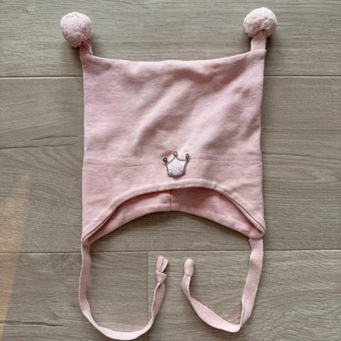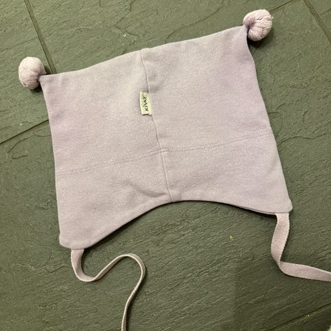 Fint brukt kivat lue i størrelse 0 (0-1 år) selges. Litt mørkere/missfarget helt på enden av snorene, se bildet. Vårlue i bomull med vindstoppere på ørene.