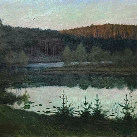 maleri malt fra Røed Gård på Jeløya 1918 vurd. solgt. Signert og datert n.t.h., tittel n.t.v. Utyd. påført nede bak på blindrammen "Julen 1919". Olje på lerret. Rammemål: H: 63 cm. + B: 73 cm. Tilhører privat kunst samling.