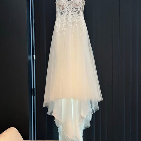 Kjolen er brukt en gang, og nypris i butikk er 23 900. UK str. 8. Den er sydd noe inn, og lagt inn nye ileggsputer i brystet. Den har også en liten knapp for å kunne legge opp slepet, slik som på bilde 4.