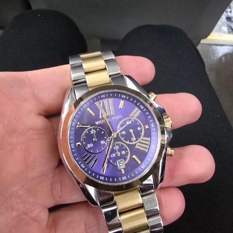 This Michael Kors Lexington Chronograph Navy Dial Unisex Watch MK8412 comes in stainless steel case with a two-tone (silver and rose gold-tone) stainless steel bracelet. Fixed rose gold-tone bezel. Navy dial with rose gold-tone hands and index hour markers. Minute markers around the outer rim. Dial Type: Analog. Luminescent hands and markers. Date display between 4 and 5 o'clock positions. Chronograph - three sub-dials displaying: 60 second, 30 minute and 24 hour. Quartz movement. Scratch resistant mineral crystal. Pull / push crown. Solid case back. Case diameter: 45 mm. Case thickness: 13 mm. Round case shape. Band width: 20 mm. Deployment clasp. Water resistant at 100 meters / 330 feet. Functions: chronograph, date, hour, minute, second. Casual watch style.