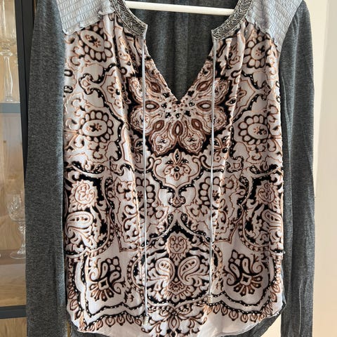 Blå, oransje, brun, gul, 70talls inspierert, paisleymønstret, silketopp, tunika med markert midje og vid, peasant-ish, square, utrigning med strikk. Justerbar knyting i livet. Trekvart ermer med knyting. 100% silke.