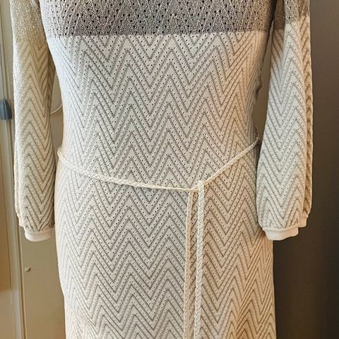 Står M på merket, men liten i størrelsen. Stoffet er i 100% viscose og underskjørtet i polyester. Fargen på bildet ble ikke helt riktig. Kan vel ligne mere på ecru. Har en kort Bolerojakke fra Vila som passer til. Kjolen er made in India.