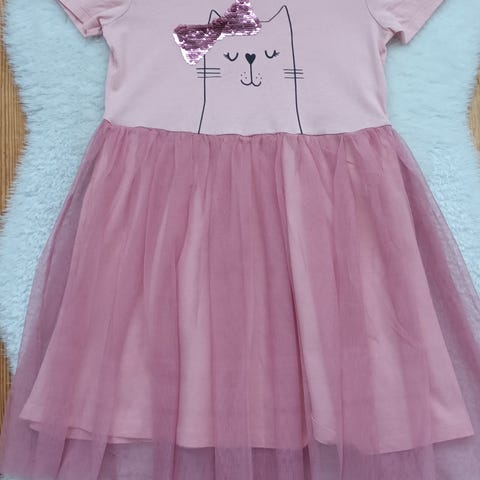 Kun prøvd på og var for stor. deretter hengt i skapet og glemt ut til den ble for liten. Bildet av hele kjolen har mest riktig farge. Etpar små striper i tyllen.