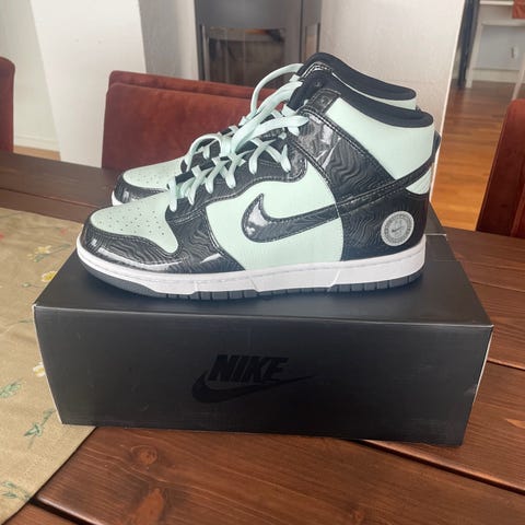 Nike Dunk High sko i størrelse 46. Disse skoene har en klassisk svart og hvit fargekombinasjon. De er laget for komfort og stil, og passer til både hverdagsbruk og sportslige aktiviteter.