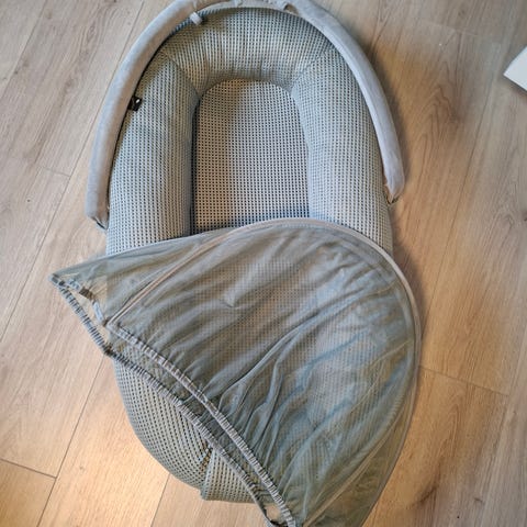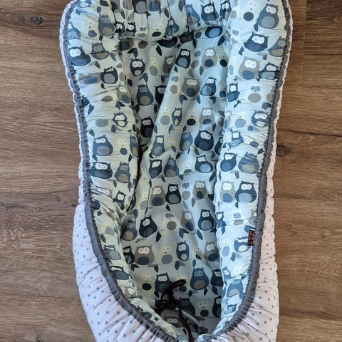 Har sydd en ekstra del nederst med borrelås slik at babyen ikke setter fast føtter i tråden. Størrelse kan justeres. Dette er et stort babynest, men likevel omfavnende. vi brukte den til hun var litt over ett år her.