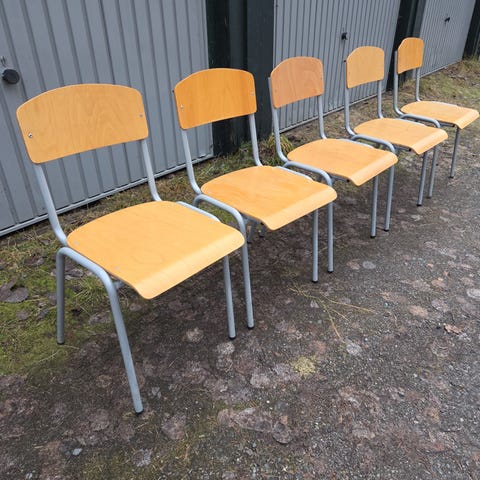 Noe slitasje på stolben ,sete . Litt forskjellig slitasje fra stol til stol. Noen trenger litt overhaling.
