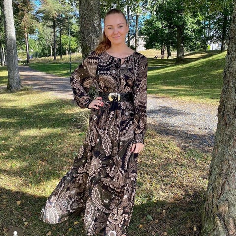 Helt Ny med tag .By Timo Maxikjole Floral Cotton-Blend Voile Gown kjole ( Var på catwalk i Oslo ;-) Meget bra kvalitet og meget flotte detaljer .Kjolen er elegant og unik Kjolen har et veldig pent fall og meget flott passform og helt nydelig blomster print og farge. Kjolen er i str S i fargen Golden Garden. Den er inspirert av Zimmermann , By Malina , Ulla Johnson Spell & The Gypsy .Kjempe Flott til nyttår, fest, bryllup , Ballkjole ,sommerfest , ferie, eller bare hverdagen 😊