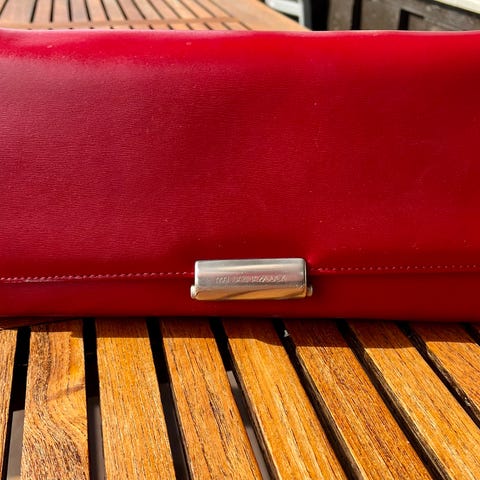 Flott veske i lær. Fin dyp brunrød farge. Bruk den som skulderveske, eller som konvoluttveske under armen. Reimen kan enkelt tas av.