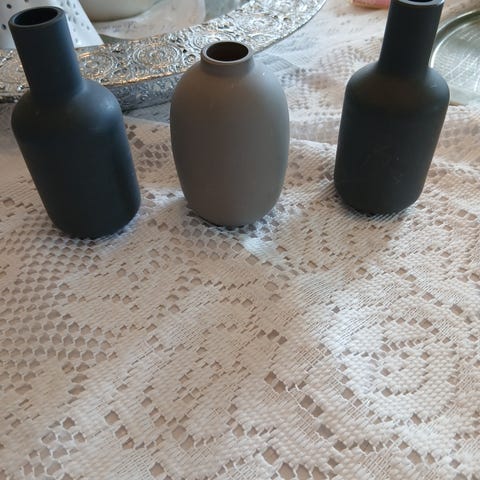 Søte minivaser i glass med gulldetaljer selges samlet. Vasene er pent brukt, og fremstår som nye. De er 13 cm høye og åpningen er 2 cm i diameter. Må hentes i Homansbyen i Oslo :)