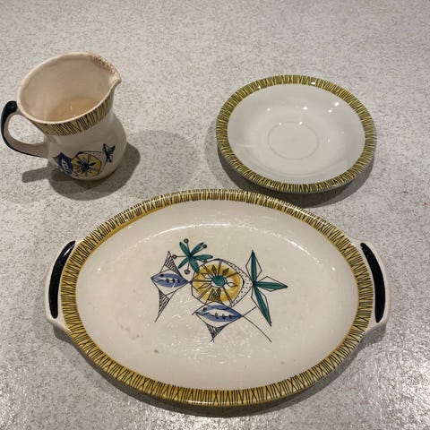 Lite fat; lengden er 24cm. Bredden er 16cm. Tror den andre skal være til sausen. Er også veldig koselig med en liten blomst. Selges samlet