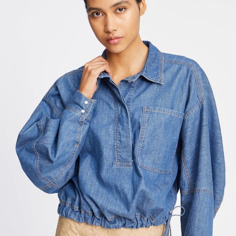 Blå denim VLogo bluse. V-hals med gulltone og blå Valentino Garavani-logo. Trekvart ermer. Spordetalj på sidene. Litt kortere foran enn bak.