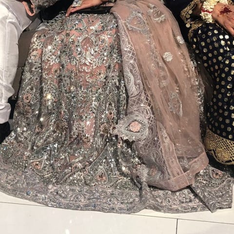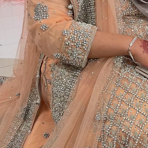 Pakistansk kjole til bryllup i størrelse L, laget av silke. Kjolen har en lilla farge med detaljer og broderier som gir et dekorativt utseende. Kun brukt 1 kveld