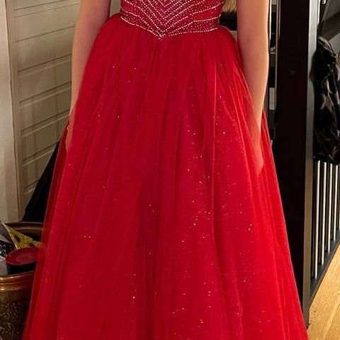 Denne lekre kjolen er kun brukt en gang, på 10.klasse ball. Utrolig fin uten noen feil. Sjal følger med. Siste bilde viser hvordan den satt på meg, 165cm høy uten høye hæler på.