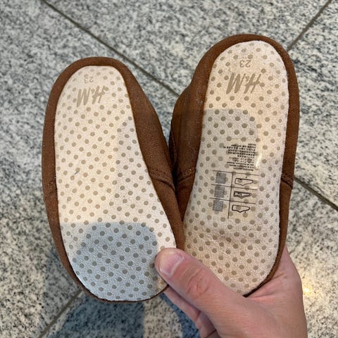 tøfler str24 innermål ca 14 cm. Imitert skinn fra H&M. Hele uten hull. Borrelås.