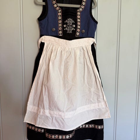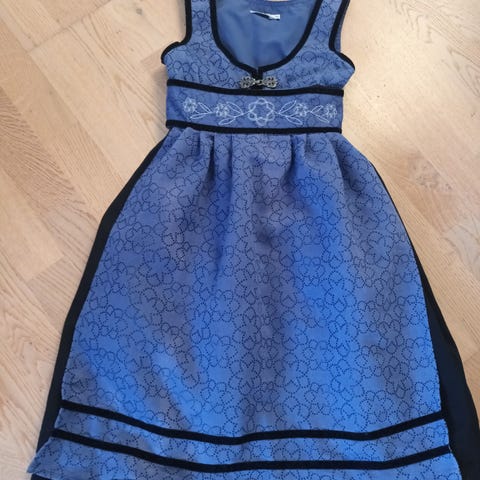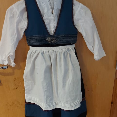 Bunad i ull med blomsterbroderi. Følger med hvitt forklede i bomull pluss bluse i bommul. str. 4 år.