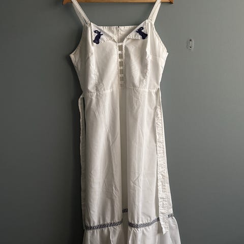 Nydelig, helt hvit sommerkjole i bomull. Oppgitt Large som størrelse i kjolen, men opplevde den mere som Medium. Kommer vel litt an på hvor vid man vil ha kjolen.