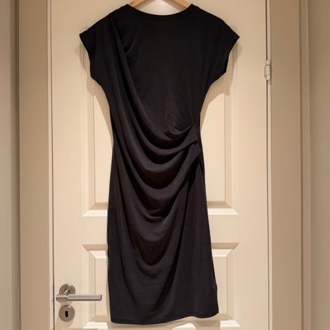 Kjolen har glidelås i siden, lang erm med vidde og elastikk nederst, skjørt med rynker fra livet og god vidde. Foret. Lengde ca. til kneet.