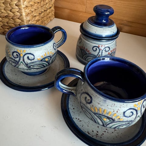 Lite brukt sett i keramikk, en kopp har en sprekk. Stått i skap fra ca 1984