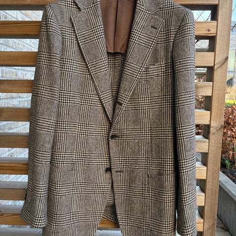 Flott Engelsk , fabrikkny jakke fra Magee .Str 46 med god lengde. 46 tilsvarer small . Er produsert i 100% Merino ull i meget eksklusiv tynn kvalitet .Lengde fra søm i rygg 79cm. Lengde på arm er 63 fra skulder søm .En meget lett sommer jakke som ikke krøller , og det er ekte horn knapper(ikke plast). Selges kr 2500-innklusiv frakt.